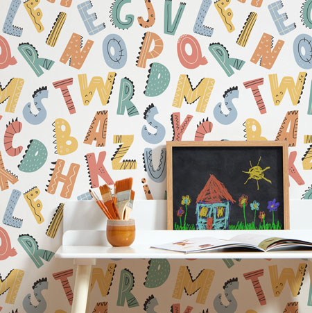 A feature wall full of wonder, look a little closer and this alphabet wallpaper is a riot of fun with teeth, scales and claws to up their learning skills.