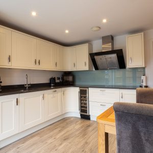The welcoming entrance hall provides access to a spacious lounge, finished with neutral décor and large windows that allow natural light to fill the room. The modern kitchen is thoughtfully designed with sleek cabinetry, integrated appliances and ample worktop space, making it well suited for both every day living and entertaining. Adjoining the kitchen is a versatile dining area, perfect for family meals or hosting guests. Adjacent utility space with plumbing for washing machine and dryer as well as a cloakroom.