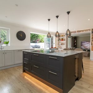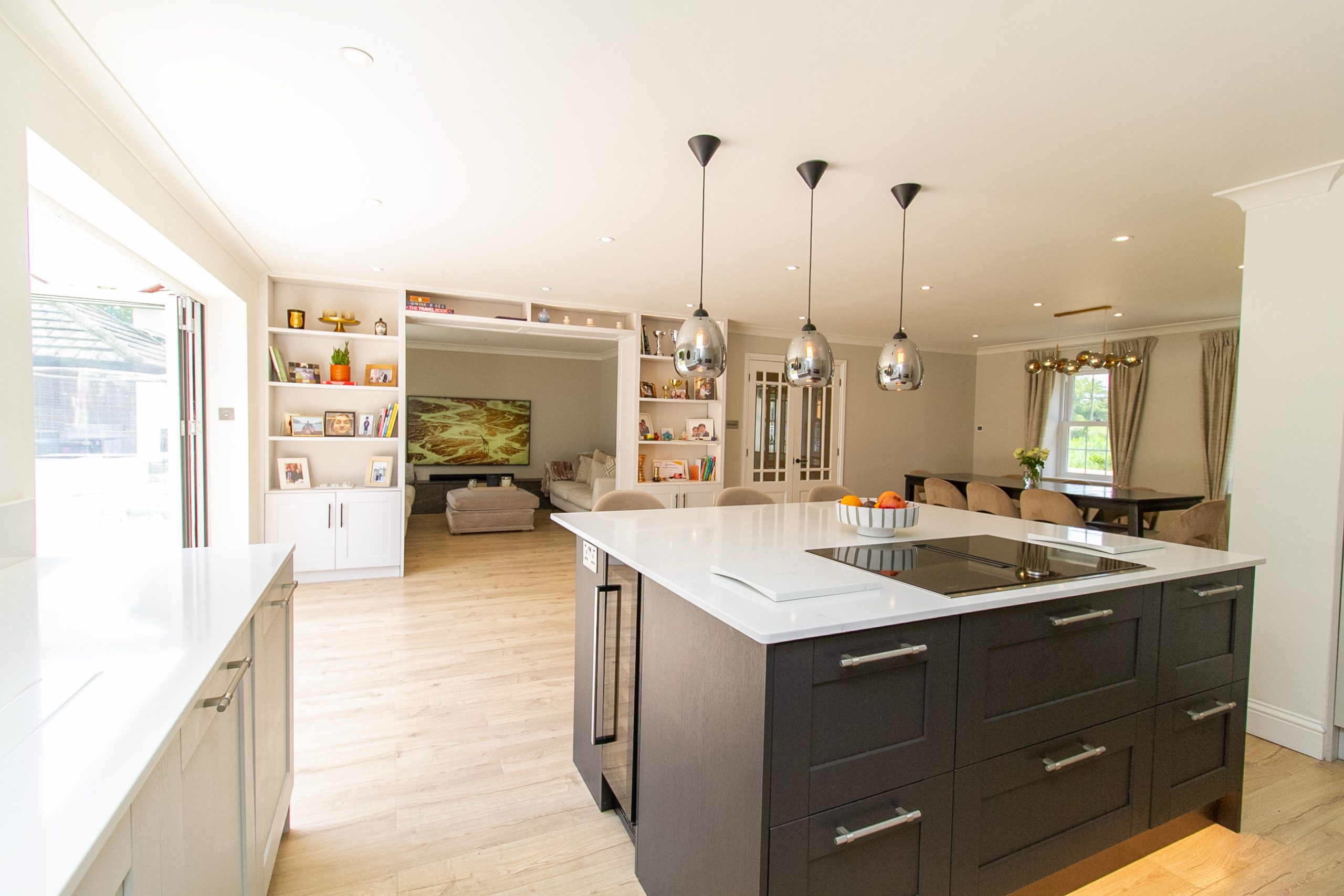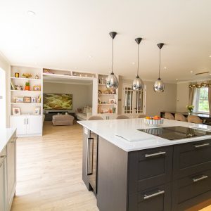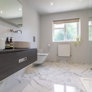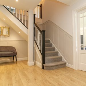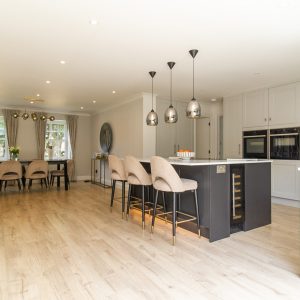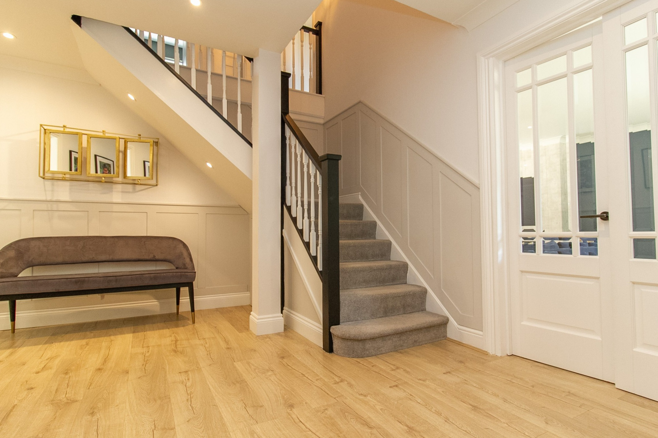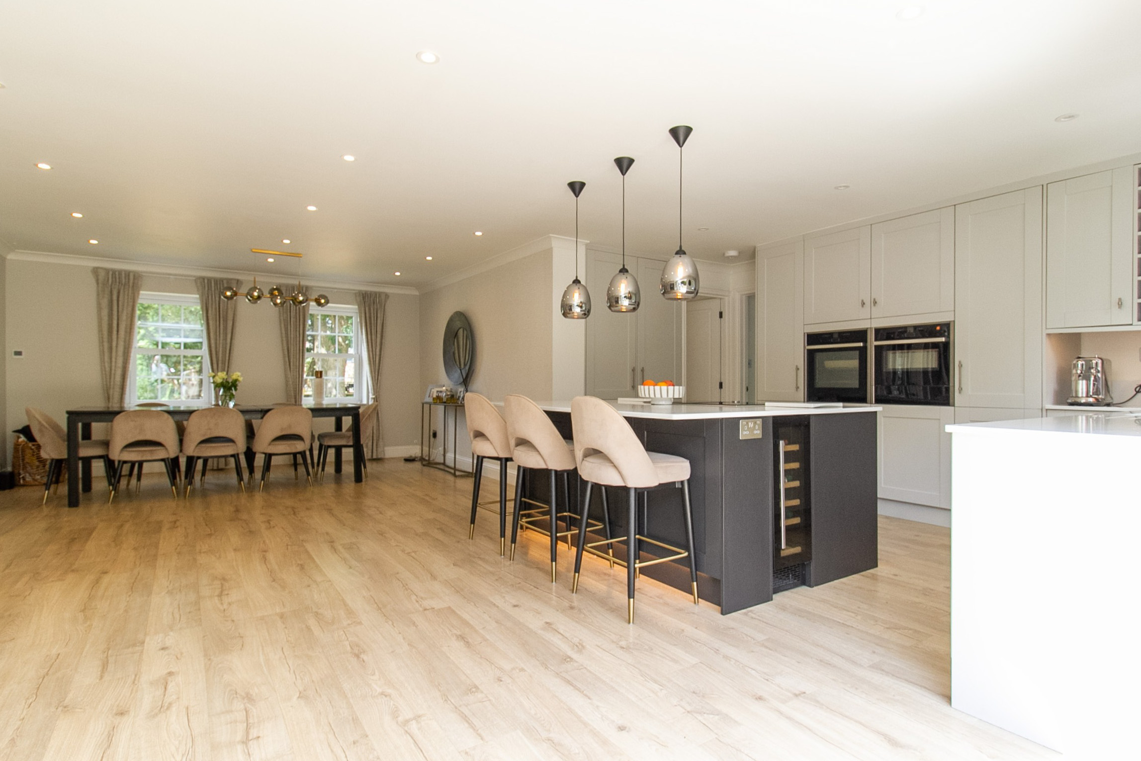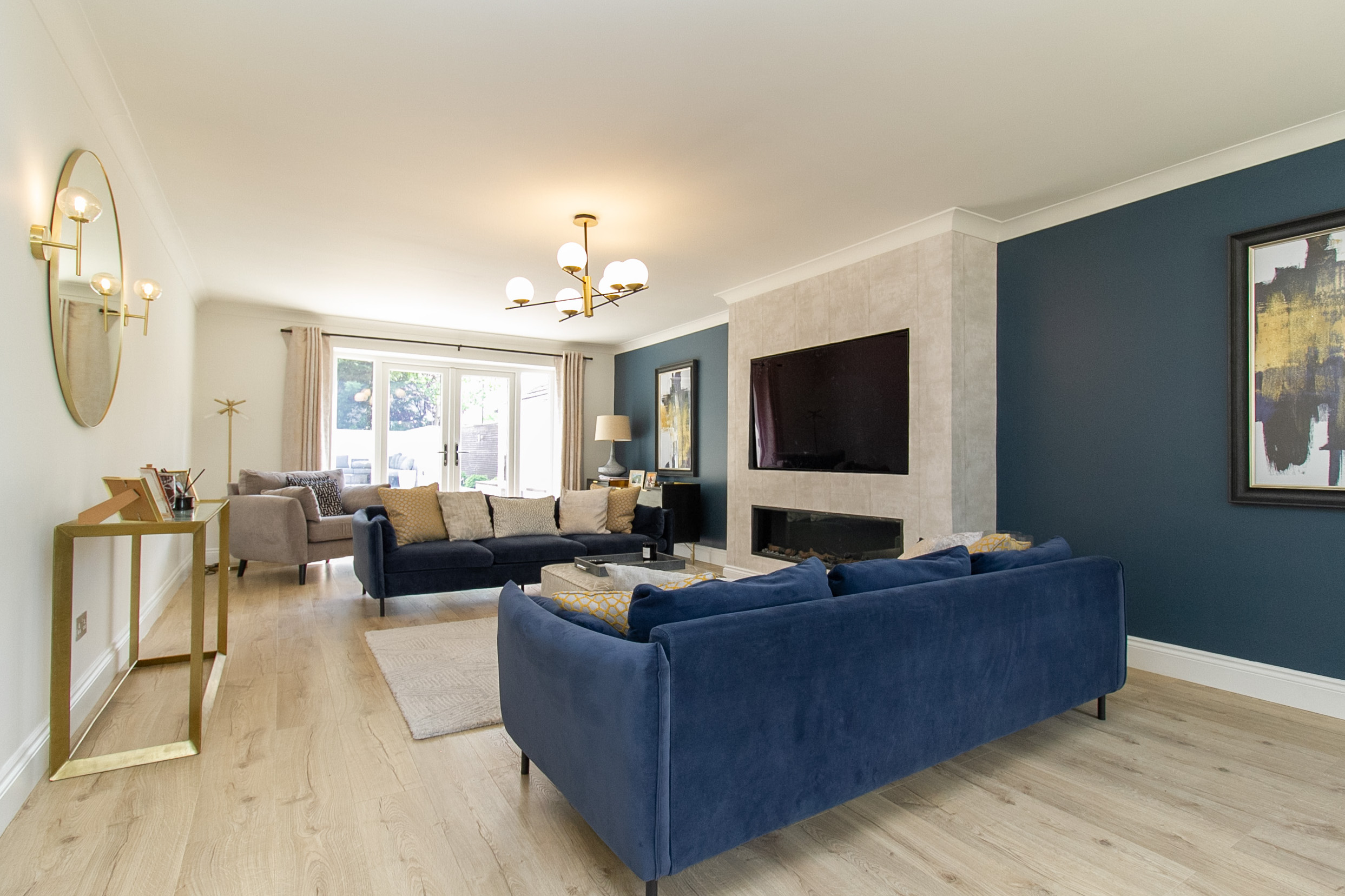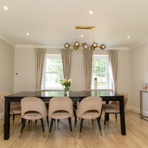The ground floor of this stunning property offers an abundance of space and natural light. Upon entry, you are welcomed by a grand entrance that leads to a large open area, setting the tone for the home’s spacious layout. The expansive living room features a cozy fireplace, rich wooden floorboards, and oversized French doors that open to the outdoors, bringing the beauty of nature inside. The large, modern kitchen boasts sleek countertops, a central island, and an open-plan design that seamlessly connects to the dining area, all complemented by the warmth of wooden flooring. A second formal dining room provides even more space for entertaining and is currently being used as a family room. Additional practical features include a utility room, a convenient downstairs W.C., and a garage that is now serving as a home gym. For those seeking a quiet retreat, the downstairs study offers tranquil views of the lake, creating the perfect environment for both work and relaxation.