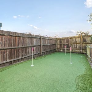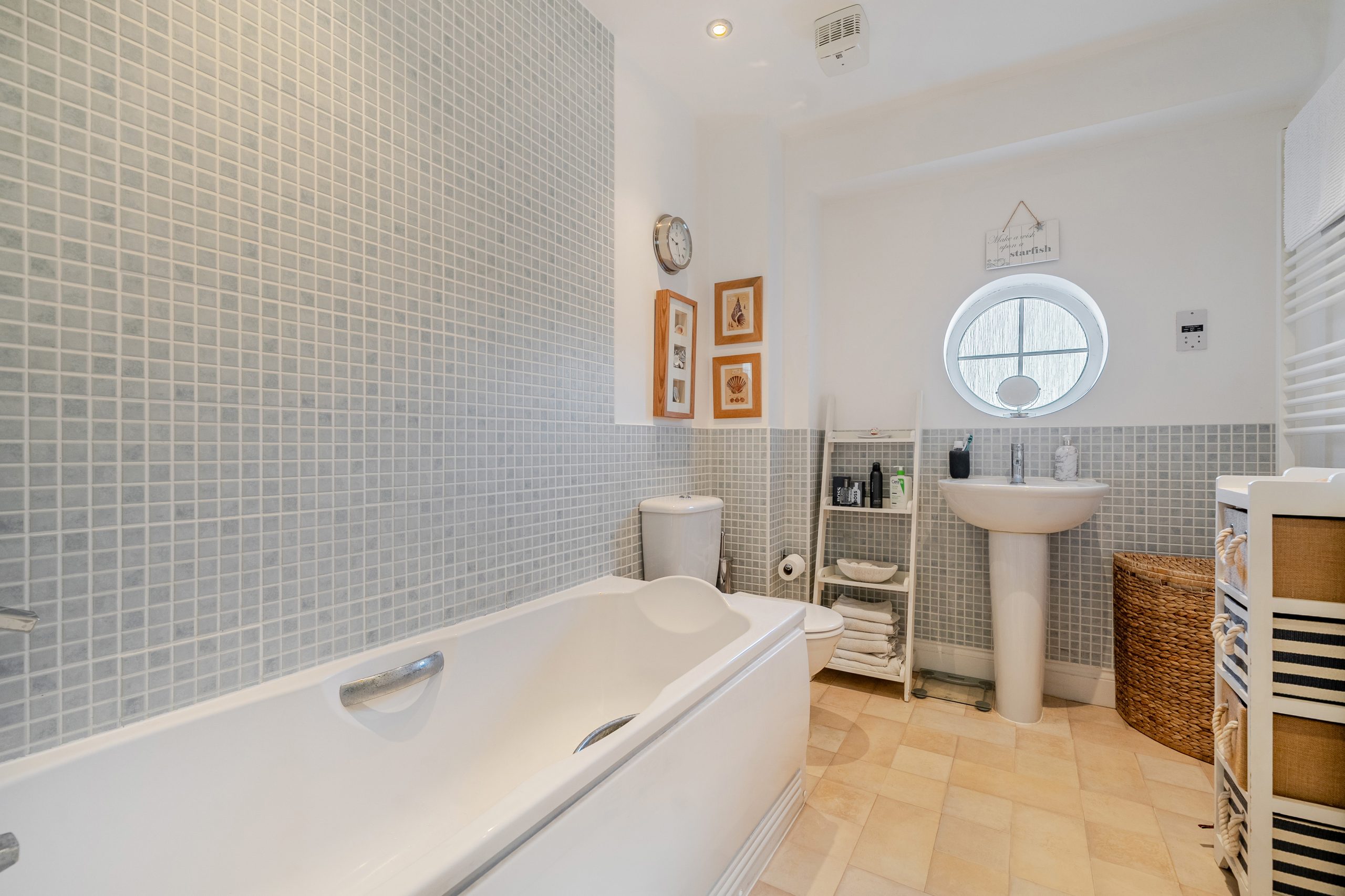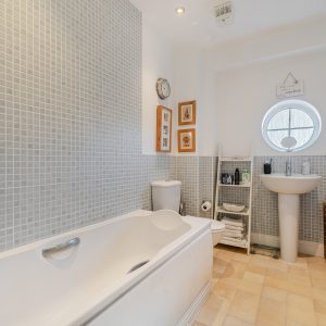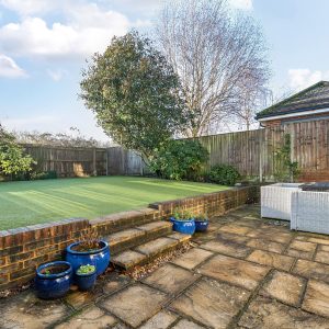 Outside, the enclosed rear garden is designed for low maintenance and enjoyment, with astro-turf, planted borders and a sunny paved patio ideal for entertaining. A fun pitch-and-putt area has been created to one side, and there is direct access from the garden into the garage.