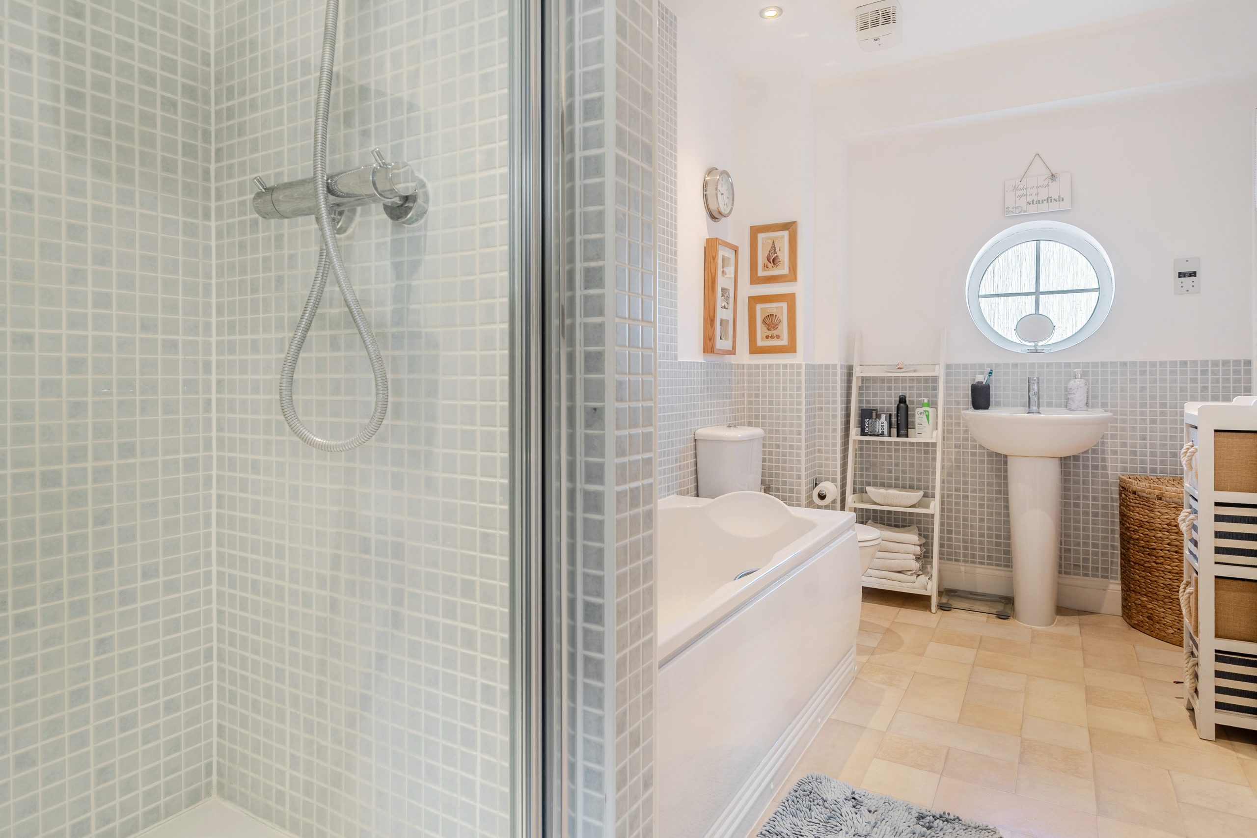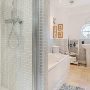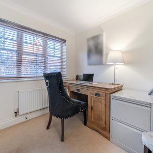 Upstairs, the first floor offers four well-proportioned bedrooms and a modern family bathroom with a separate shower. The principal bedroom features built-in mirrored wardrobes and a stylish en-suite shower room.