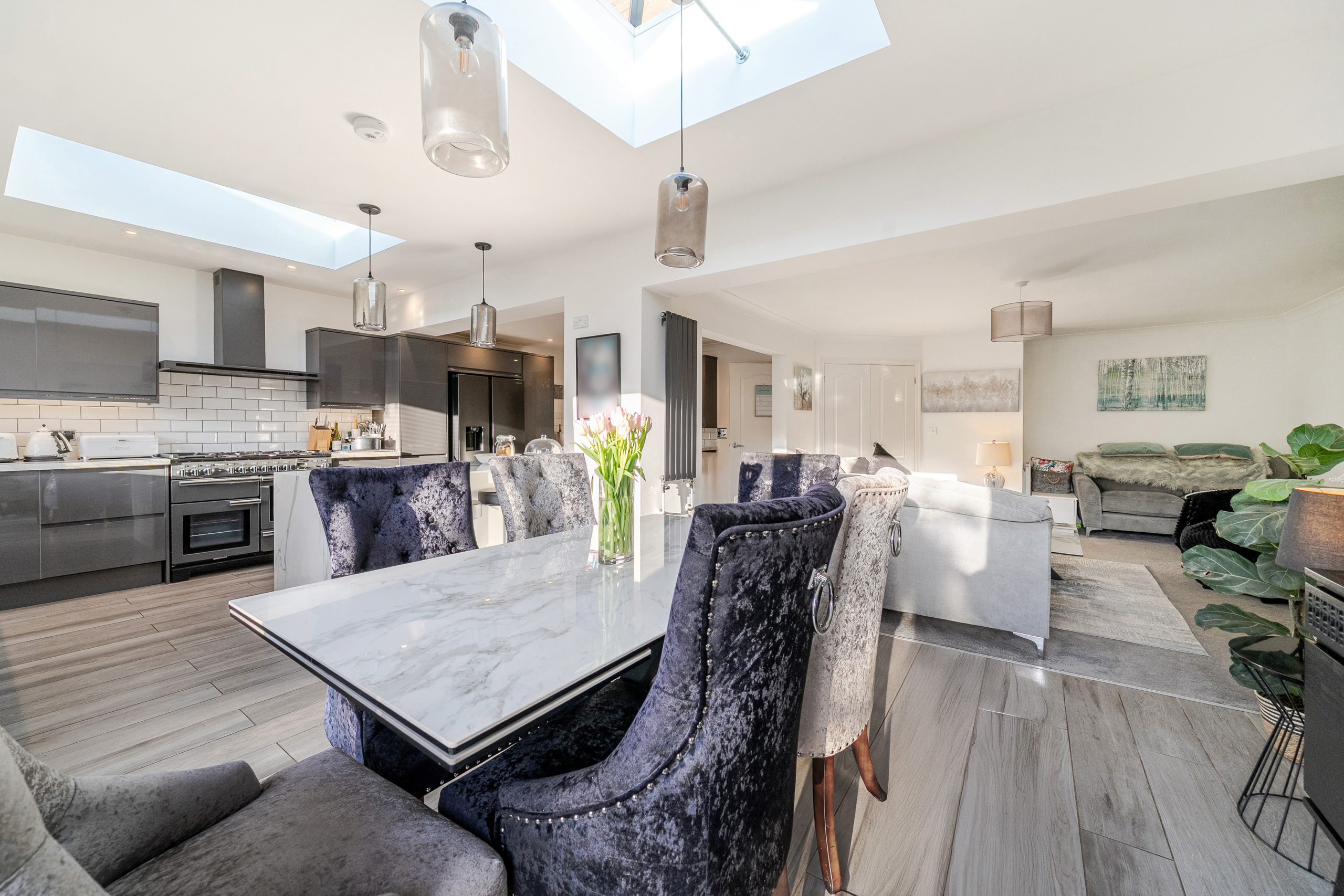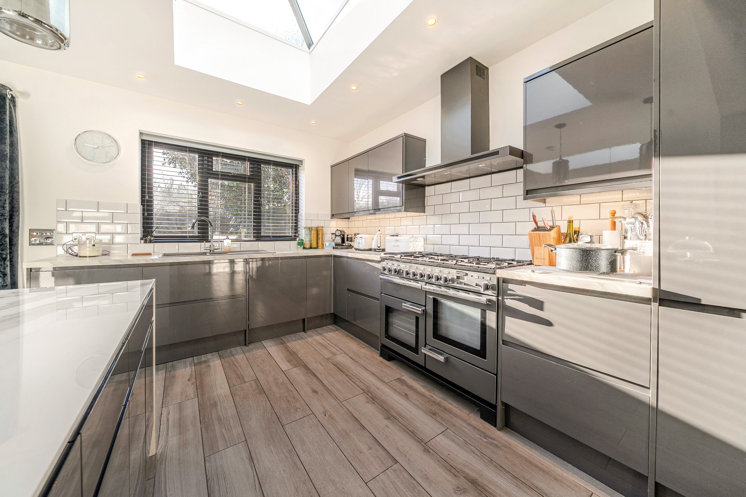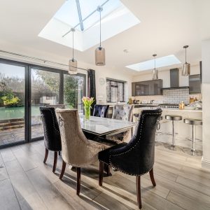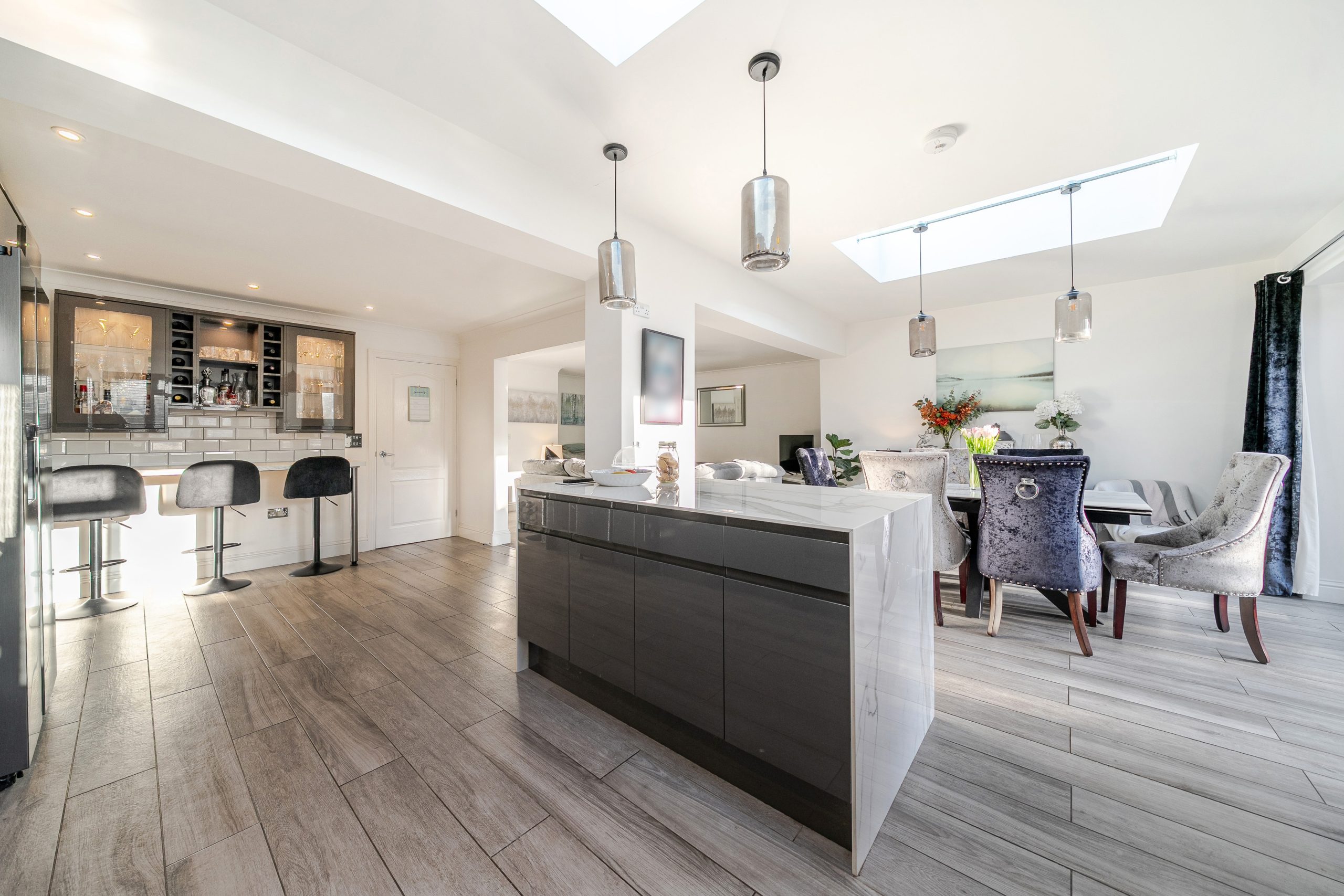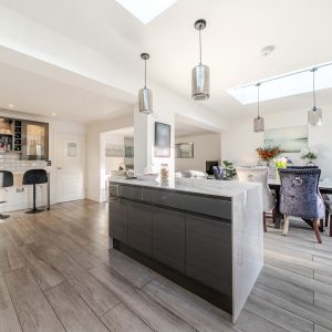 The heart of the property is the impressive bespoke open-plan kitchen, dining and living space, featuring bi-fold doors opening onto the rear garden with views beyond. The contemporary kitchen is well designed with integrated appliances, a central island and breakfast bar, and benefits from underfloor heating that continues through to the dining area.