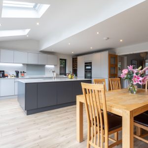 Upon entering the property there is an entrance hall with space for coat and shoe storage and a ground floor WC. The front of the property is the generous living room which benefits from feature fireplace with gas fire, fitted storage, bay window and wood flooring. Adjacent to the living room is a play room with glazed double doors. The rear of the property is the superb open plan kitchen space with large kitchen island with undermounted sink and filtered drinking water tap, a range of fitted units and storage, a suite of integrated appliances and triple skylight windows in the roof. The kitchen opens up via bi-folding doors out to the patio and garden beyond. Off the kitchen there is a study which also has an access door into the converted garage which still offers good storage. This whole rear area of the ground floor benefits from underfloor heating.