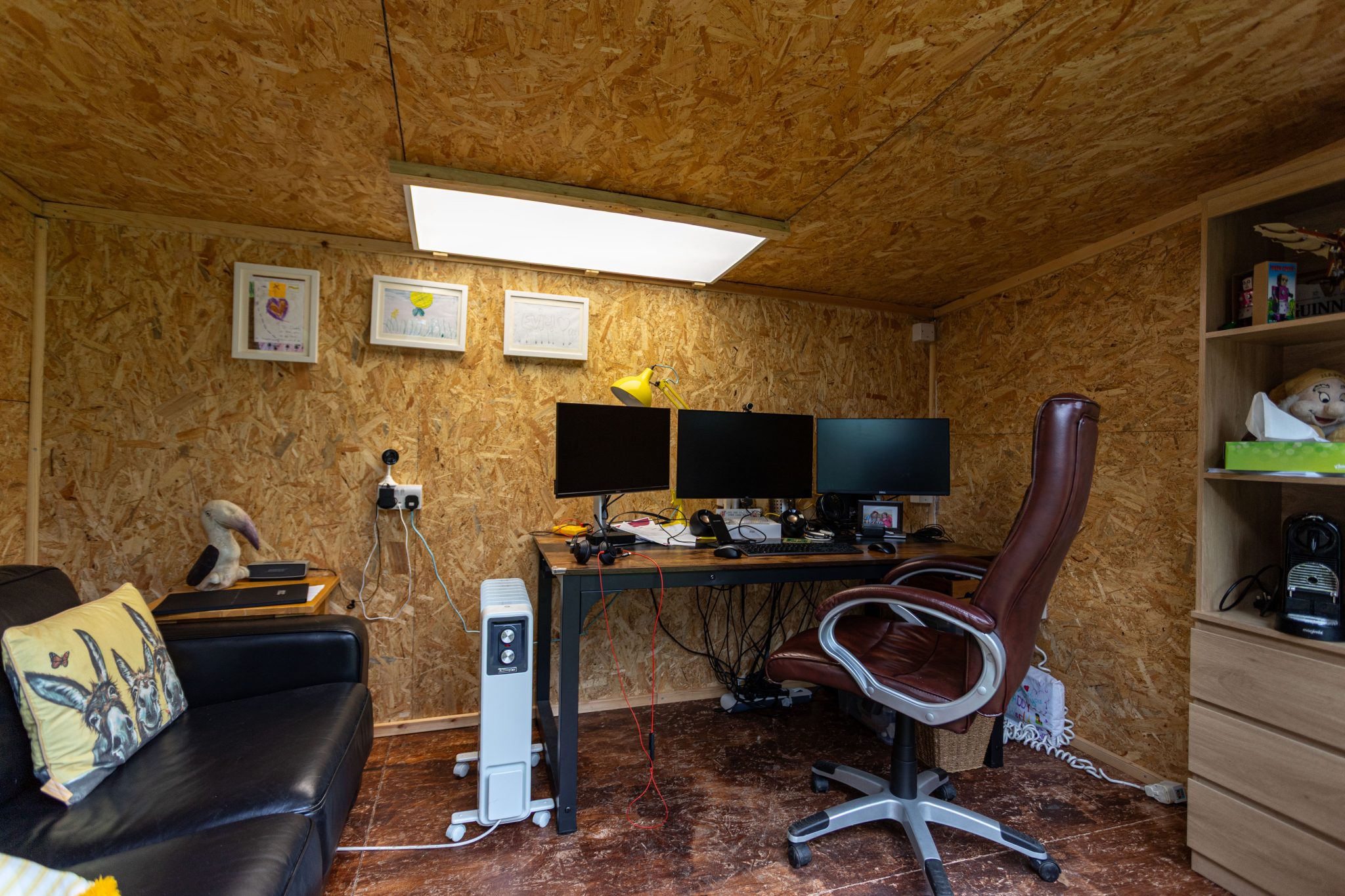 Outside there is a generous frontage laid to lawn with driveway parking and side access gate. To the rear there is a patio area directly off the kitchen leading down to an area of lawn and then a further play area where the home office cabin is also sited. This cabin beneifts from a power and broadband supply.