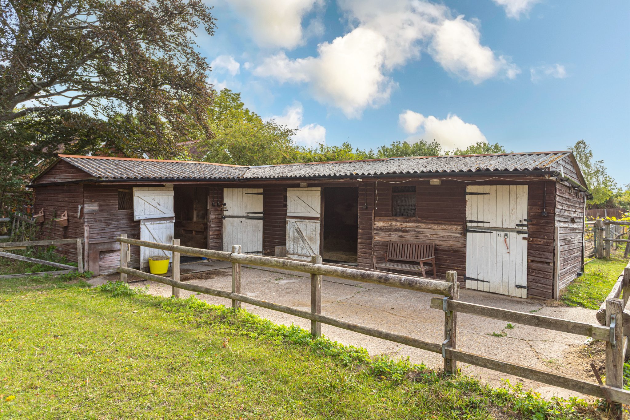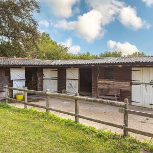 Accessed over a gated private access lane and benefitting from power and water supply, the stable block is of timber construction with fenced area of