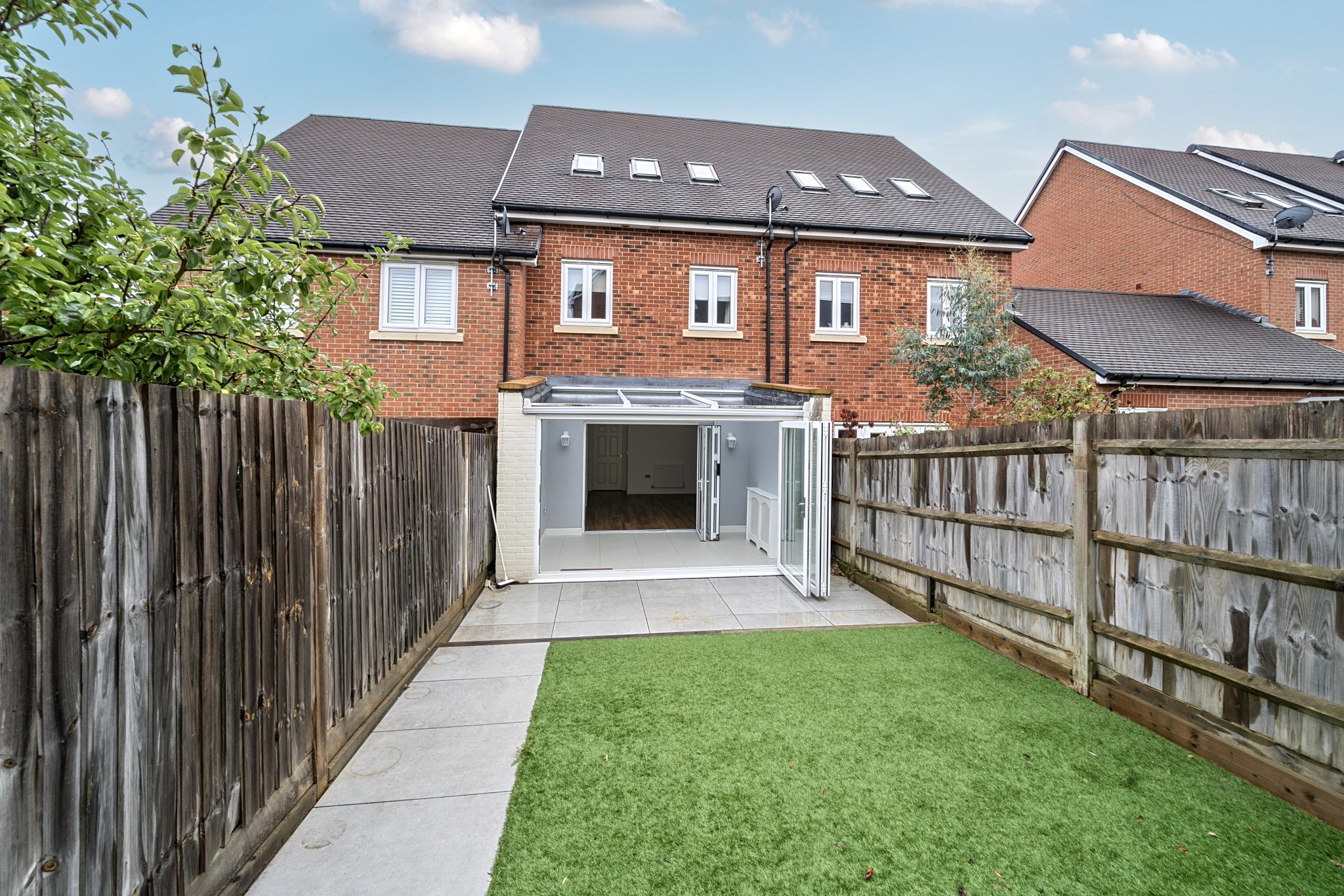 On the ground floor the entrance hall provides access to the stylish fitted kitchen with integrated appliances. The bright living/dining room leads through bi-fold doors to the conservatory which is currently being used as a dining room which also has bi-fold doors out to a patio area overlooking the enclosed rear garden. There is also a downstairs cloakroom.