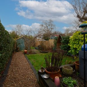 Outside, the private rear garden is beautifully landscaped with a lawn, patio seating area, mature planting, and a wooden shed, offering an ideal space for outdoor dining and relaxation.