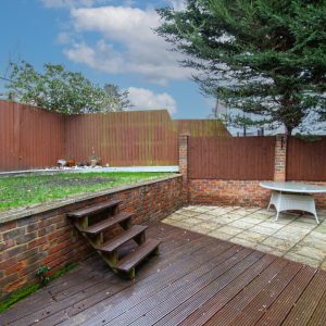 The rear garden has been attractively landscaped across two levels, featuring a blend of paved and decked patio areas with steps leading up to a lawned garden and a delightful wooded seating space. Practical features include a garage and an adjoining workshop, providing excellent storage solutions and space for hobbies or DIY projects. Driveway parking ensures convenience for multiple vehicles, making this home as practical as it is attractive.