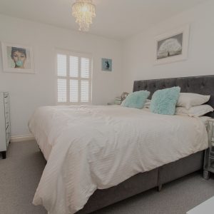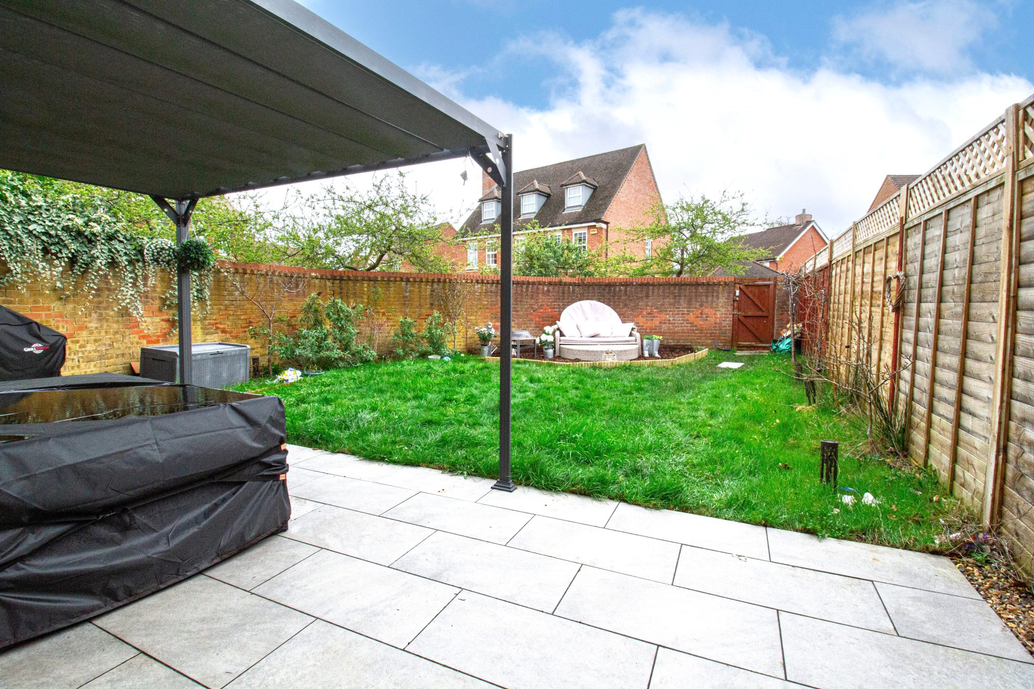 The rear garden offers a generous outdoor space, thoughtfully designed to include a patio area ideal for outdoor seating and entertaining, alongside a well-maintained lawn. A further barked section provides a versatile area, perfect for additional seating or a children’s play space. A gate at the rear of the garden provides convenient access to the garage and car park.