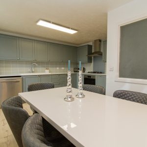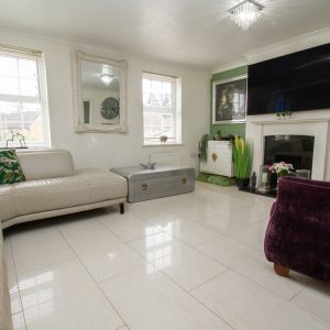 The kitchen / dining room is thoughtfully designed with a stylish finish and ample workspace. Across the landing is an impressive double-aspect living room, flooded with natural light. The spacious room features stylish ceramic tile flooring and a striking feature fireplace, creating a warm and inviting focal point for relaxing or entertaining.