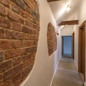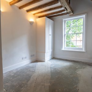 From the front door there is a well proportioned open plan kitchen and living room space. The kitchen has undergone modernisation by the developer with new fixtures and appliances - there is an opportunity for a buyer to specify changes and further finishes here, as well as selecting flooring and decor. The space itself features vaulted ceiling with exposed timber beams, stepping down from the kitchen into the living room area where there is an exposed brick chimney breast and open fireplace. Off the kitchen is the hallway leading on to the bedrooms and bathrooms. Bedroom one is a generous double room with fitted oak wardrobes, vaulted ceiling and more exposed timbers. Bedroom two is a large single but could work as a double, and also benefits from storage and the same exposed timber beams. The bathroom has also been modernised with a new bath, shower cubicle, vanity sink and letterbox tile splashback.
