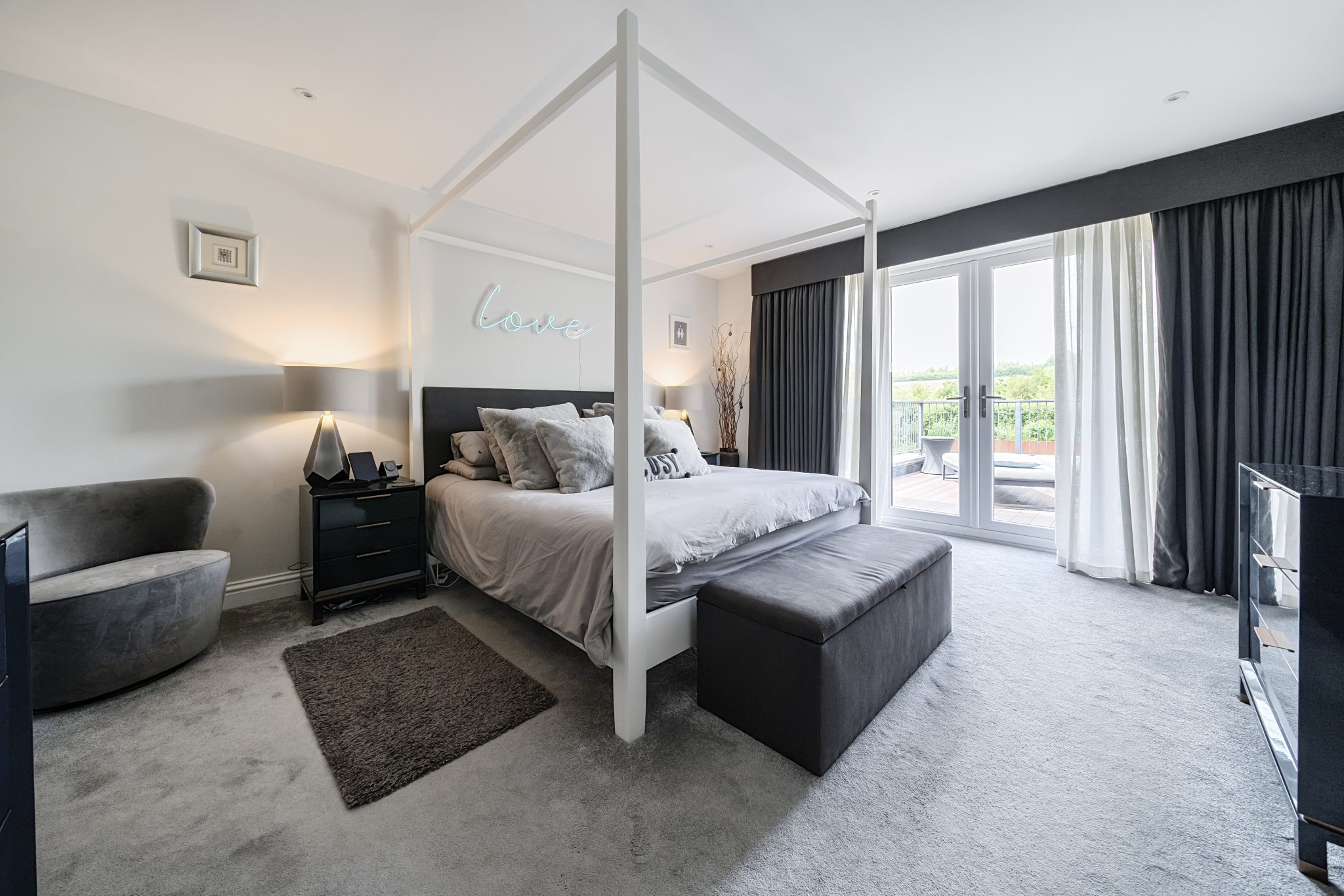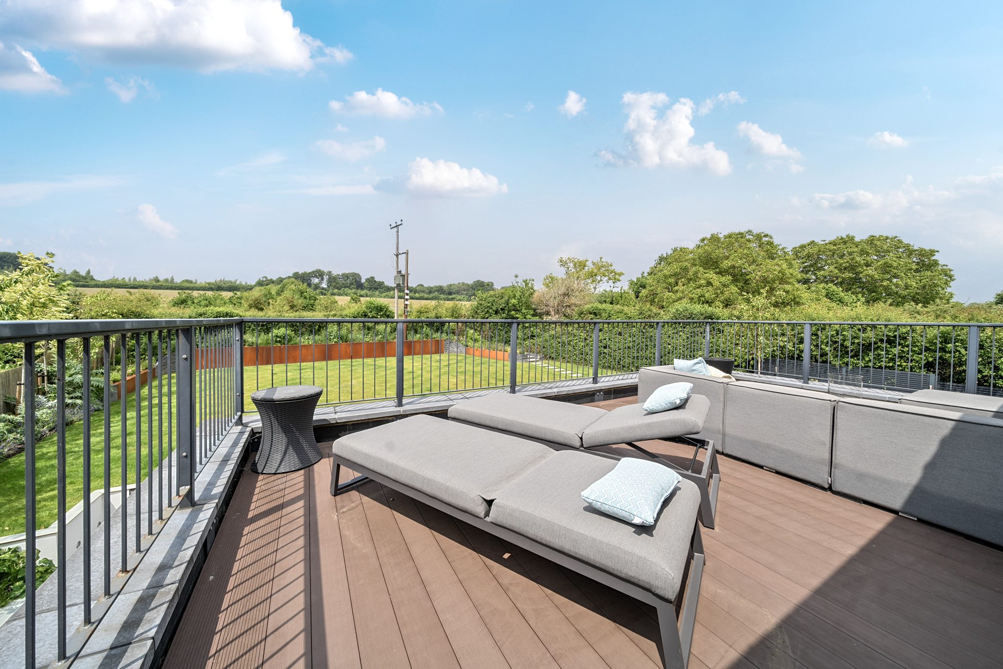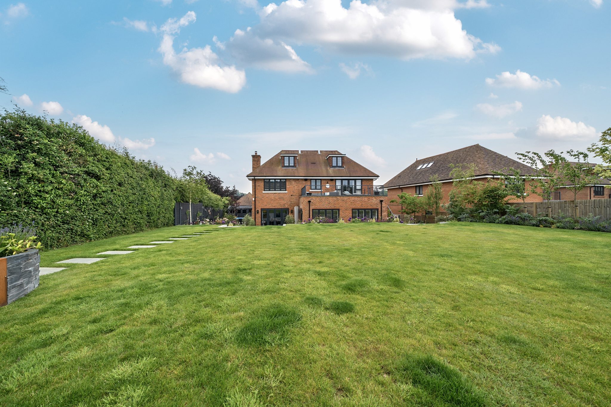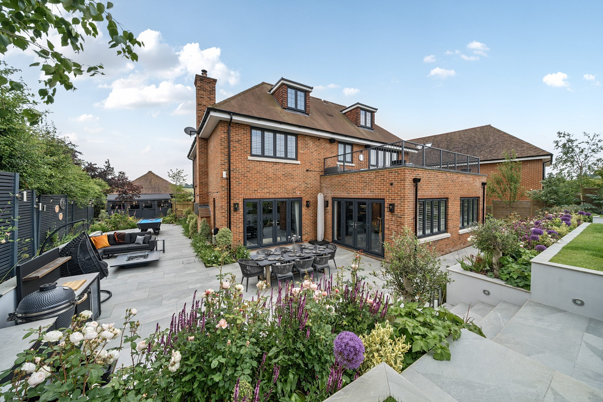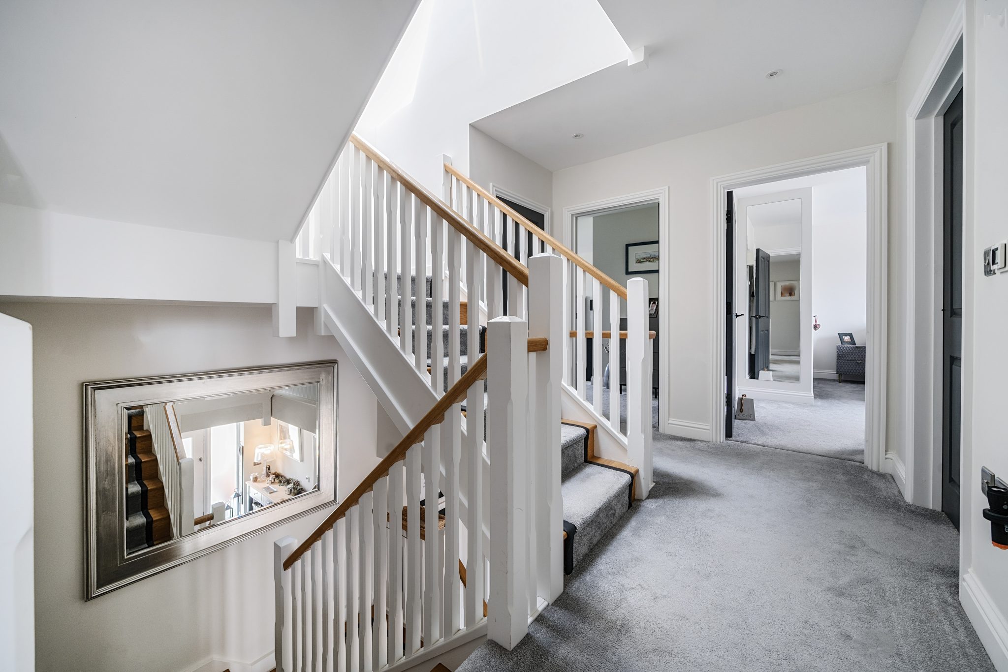 The galleried landing leads to four substantial bedrooms. Two of the bedrooms have built-in wardrobes, with the luxurious principal suite offering a dressing room, a spacious fitted en-suite bathroom with separate shower. There is access to a private sun terrace with steps leading down to the garden, a perfect place to relax and enjoy the stunning views over the garden and countryside beyond.