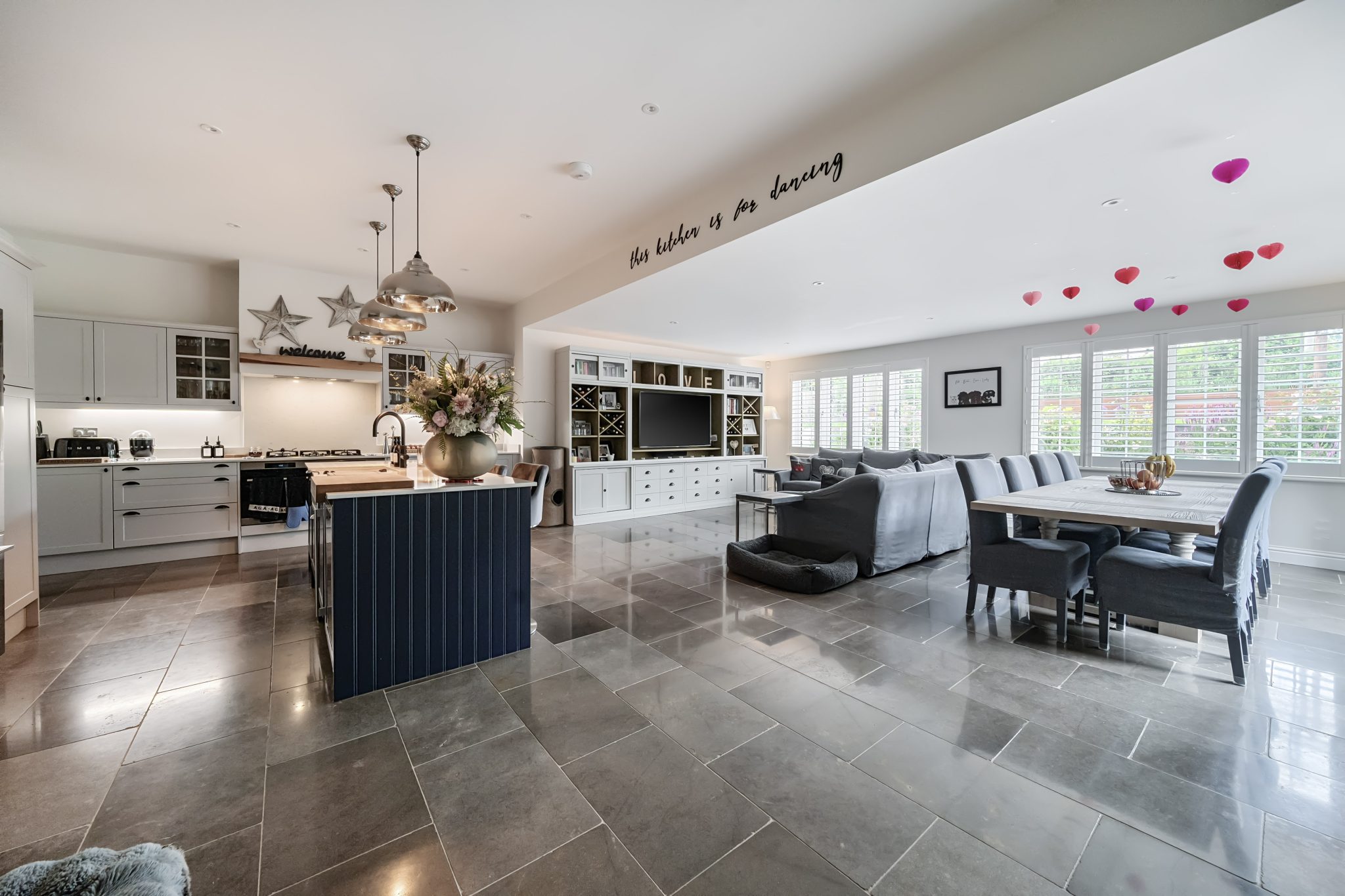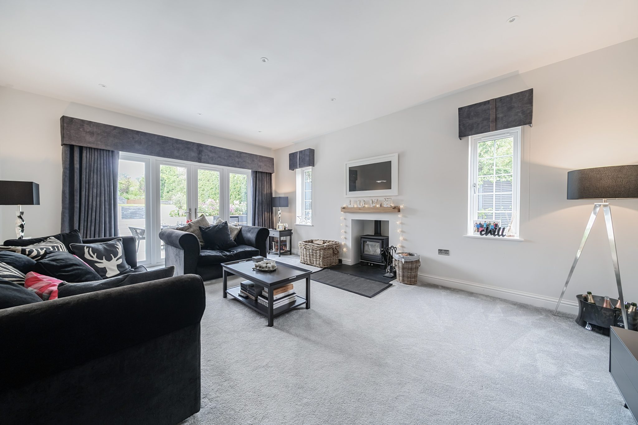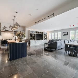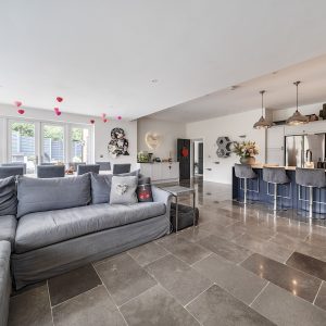 You are welcomed into an impressive entrance hallway with a downstairs cloakroom. The heart of the home is the attractive, high specification open-plan kitchen/breakfast/dining room, featuring bespoke cabinetry, integrated appliances, a central island with breakfast bar and French doors opening onto the garden. An ideal space for family living. A separate fitted utility room, located at the rear of the kitchen, provides access to the side of the property. The generous and elegant living room boasts a feature open fireplace with access to the rear garden through French doors. Additional reception rooms include a formal dining room, currently used as a family room and a home office.