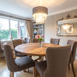 The welcoming entrance hall leads to a generous sitting room, featuring a focal point fireplace and large windows that draw in natural light. Adjacent is a separate dining room, ideal for formal entertaining or family gatherings.