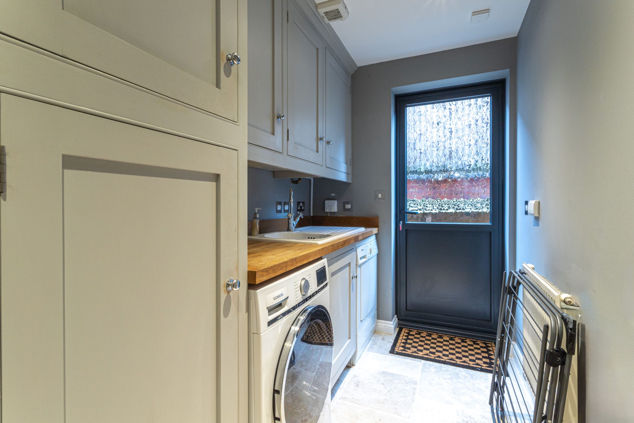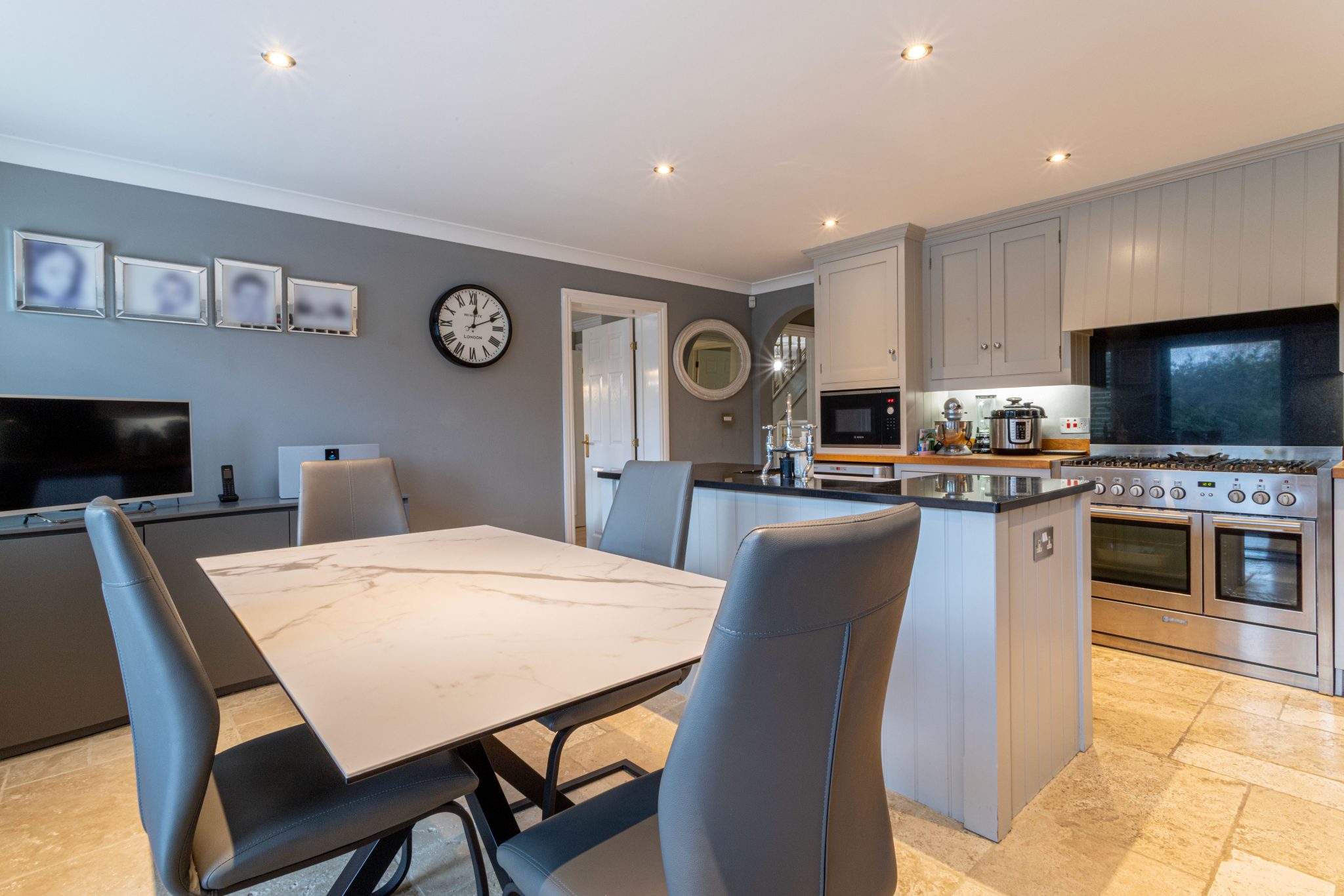 The contemporary kitchen is well appointed with a range of fitted units, integrated appliances, and ample work surfaces, complemented by a practical utility room that provides additional storage and laundry space.