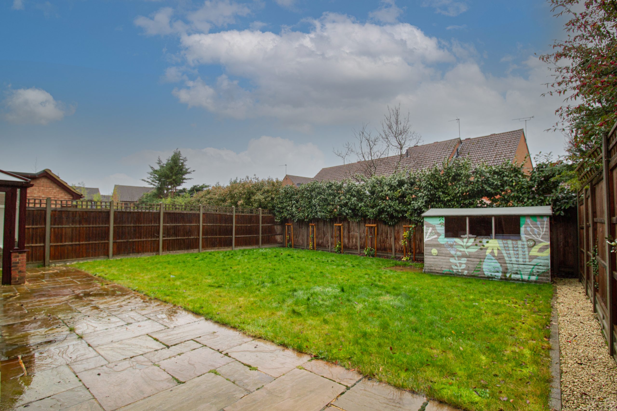 The rear garden is both spacious and well maintained, offering a substantial lawn, patio seating area ideal for outdoor dining, and a shed.