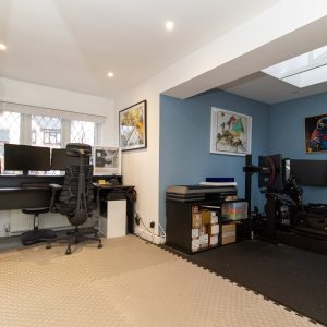 The ground floor has a range of flexible living spaces, including a well presented main living room featuring a cosy fireplace, wood flooring and a large bay window that floods the room with natural light. An open plan living and dining flows through to the garden via French doors. The kitchen is a standout feature, fitted with sleek white cabinetry, wooden worktops, a breakfast bar seating area and space for free standing appliances. Off the kitchen there is conservatory overlooking the garden. To complete the ground floor there is a large office/gym.