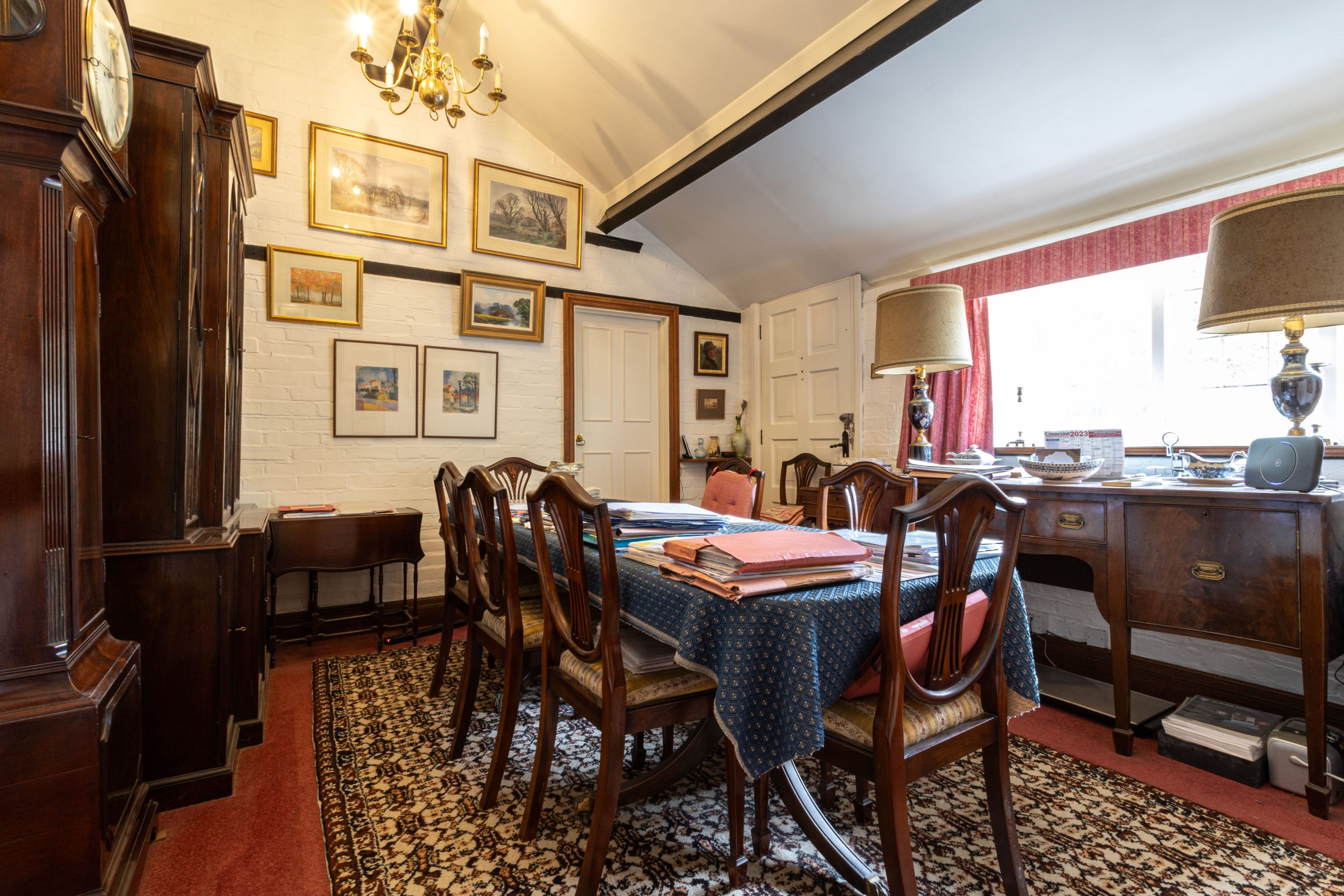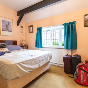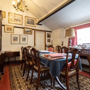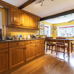At the back of the house there is a dining room with exposed timber beams and a wonderful vaulted ceiling. This leads onwards to a ground floor bedroom which has an en-suite bathroom.