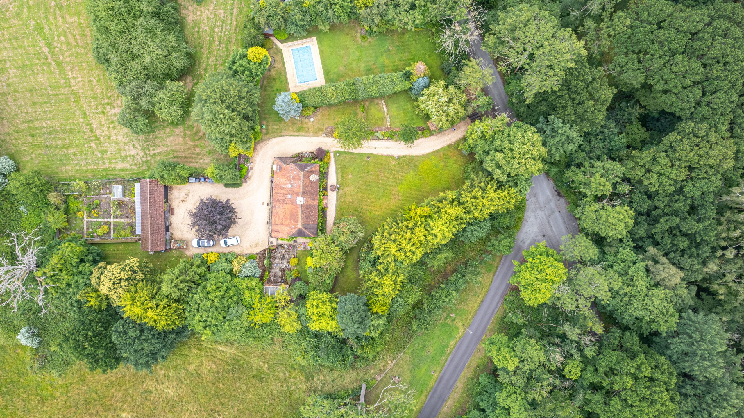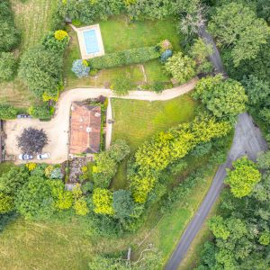 With grounds of around one acre the property has a large frontage which is mainly laid to lawn. It enjoys a throughroughly private plot surrounded by trees, hedging and shrubs. There is a large area of lawn to the side of the property which is also where the swimming pool is located.