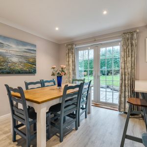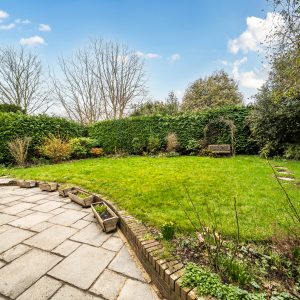 The private, enclosed rear garden is mainly laid to lawn and bordered by mature hedging, shrubs and flower beds, with gated side access to the front. A sunny patio area, accessed directly from both the dining area and living room, provides an ideal space for outdoor dining and entertaining.