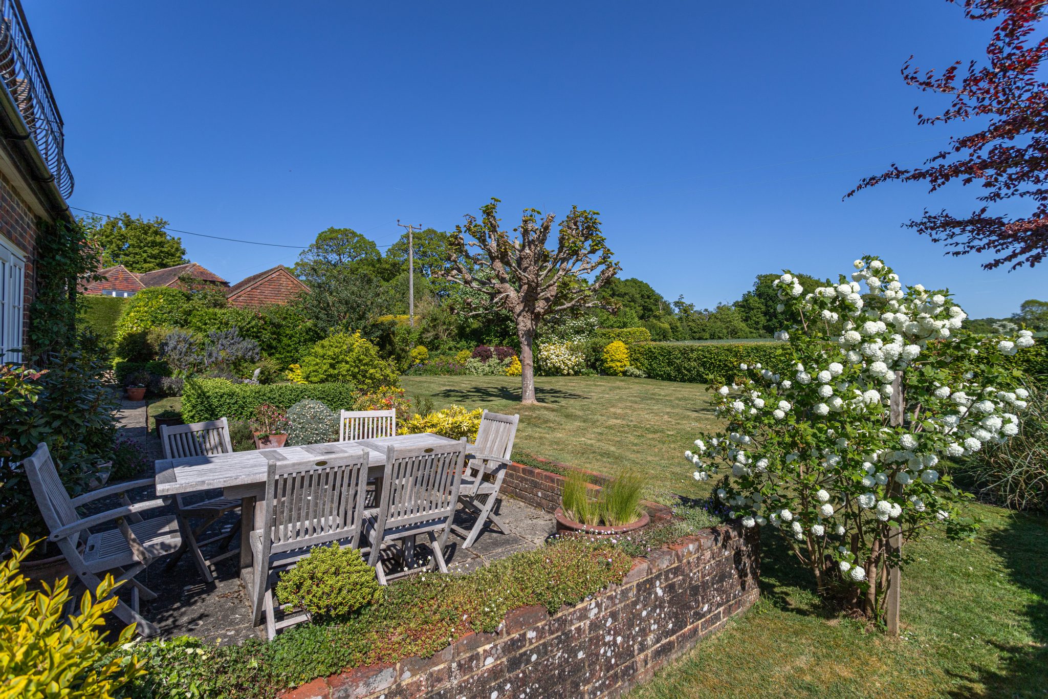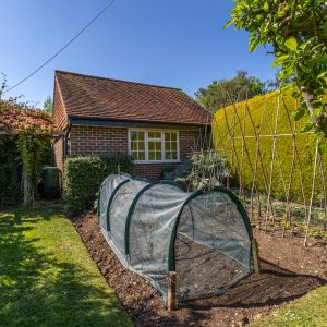 The striking enclosed south-east facing garden with established hedgerow, wraps around from the rear along one side to the front of the property. The well-maintained garden is mainly laid to lawn with mature planting, shrubs, flowers and trees. There is also a well-established vegetable garden and patio area providing an ideal space for entertaining or relaxing in the sunshine. To one side of the front garden is a gravel driveway providing parking for several cars leading to a detached double garage.