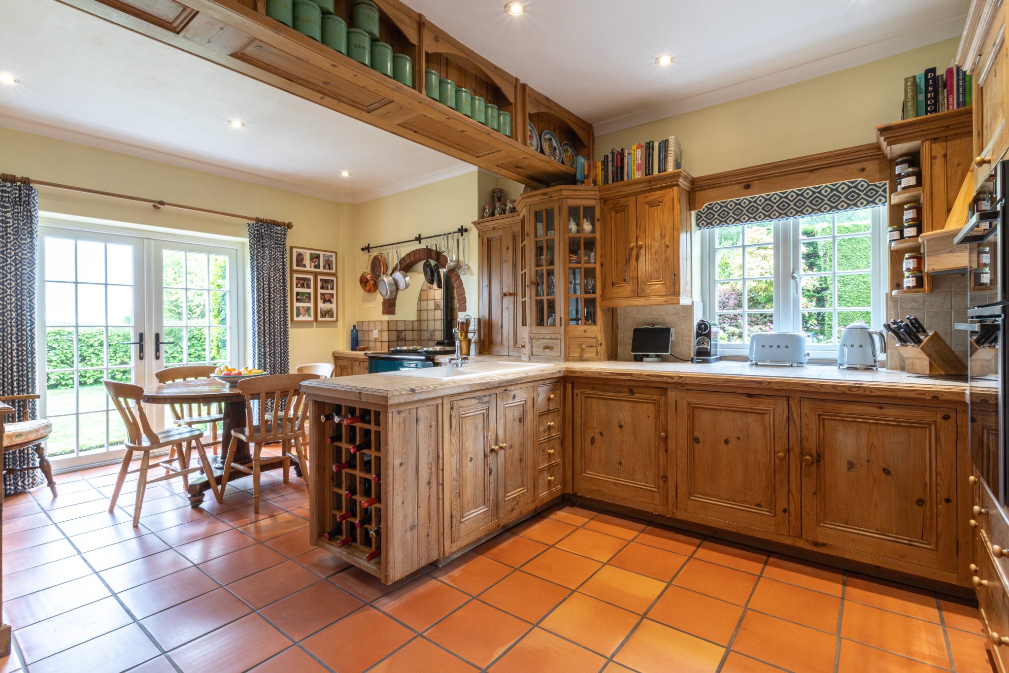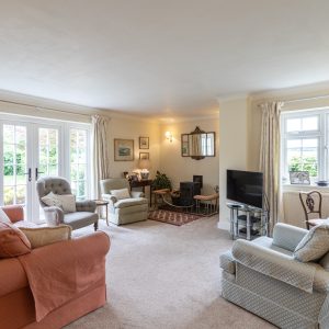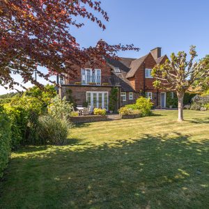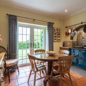 You are welcomed into the hallway which leads to the generous living room with feature log burning stove and French doors out to a patio overlooking the lovely rear garden. There are double doors from the living room into a good-sized dining room. The fitted kitchen breakfast room with traditional cabinetry, oil AGA and integrated appliances benefits from French doors out to the pretty front garden.