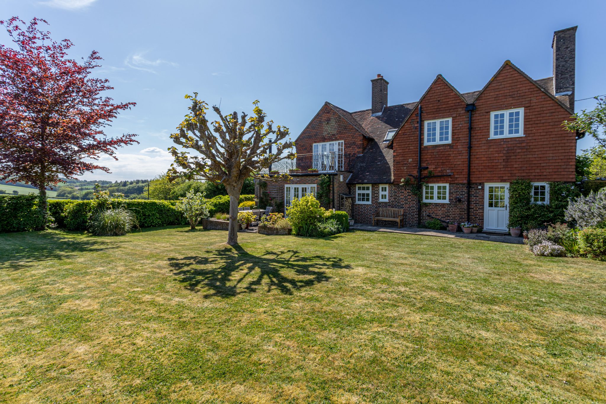 On the first floor is a galleried landing and four bedrooms all with impressive countryside views. The main light and airy triple aspect bedroom benefits from built-in wardrobes and a balcony overlooking the garden and countryside beyond. The other bedrooms have built-in wardrobes or cupboards. There is a family bathroom suite.