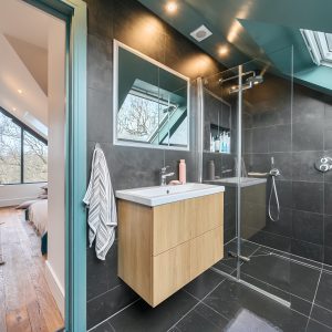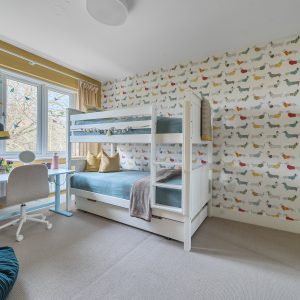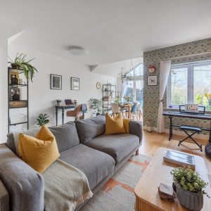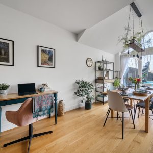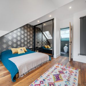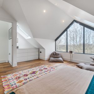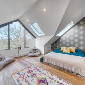 The first floor has two generous double bedrooms and a third smaller bedroom great for an office or nursery, including the principal suite which benefits from a modern en-suite shower room. The family bathroom also serves this level. The second floor showcases a stunning loft conversion a standout feature of this home offering a further spacious double bedroom bathed in natural light. The striking full-height glazing and skylights create an impressive open feel with tree-top views, making this floor ideal as a primary bedroom, guest accommodation, or a relaxing studio space.