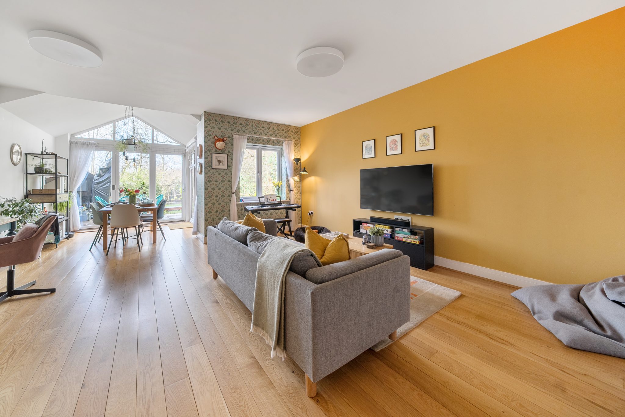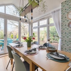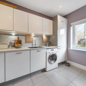 The attractive rear garden backs directly onto woodland, providing a private and tranquil backdrop, also a large outbuilding on the side of the house with electrics to accommodate the storage needs. l A limestone patio sits immediately outside the dining space, perfect for entertaining or enjoying the surroundings. The home further benefits from allocated parking and additional visitor spaces nearby.